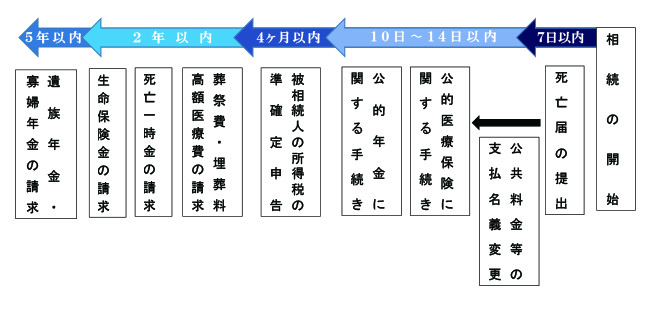 相続に関わる手続きは多岐にわたり、中には期限が定められているものも少なくはなく、万が一、期限を徒過した場合には相続人が不利益を被るおそれがありますので、必要な手続きとその期限、全体の流れを把握した上で、できうる限り迅速に対応する必要があります。